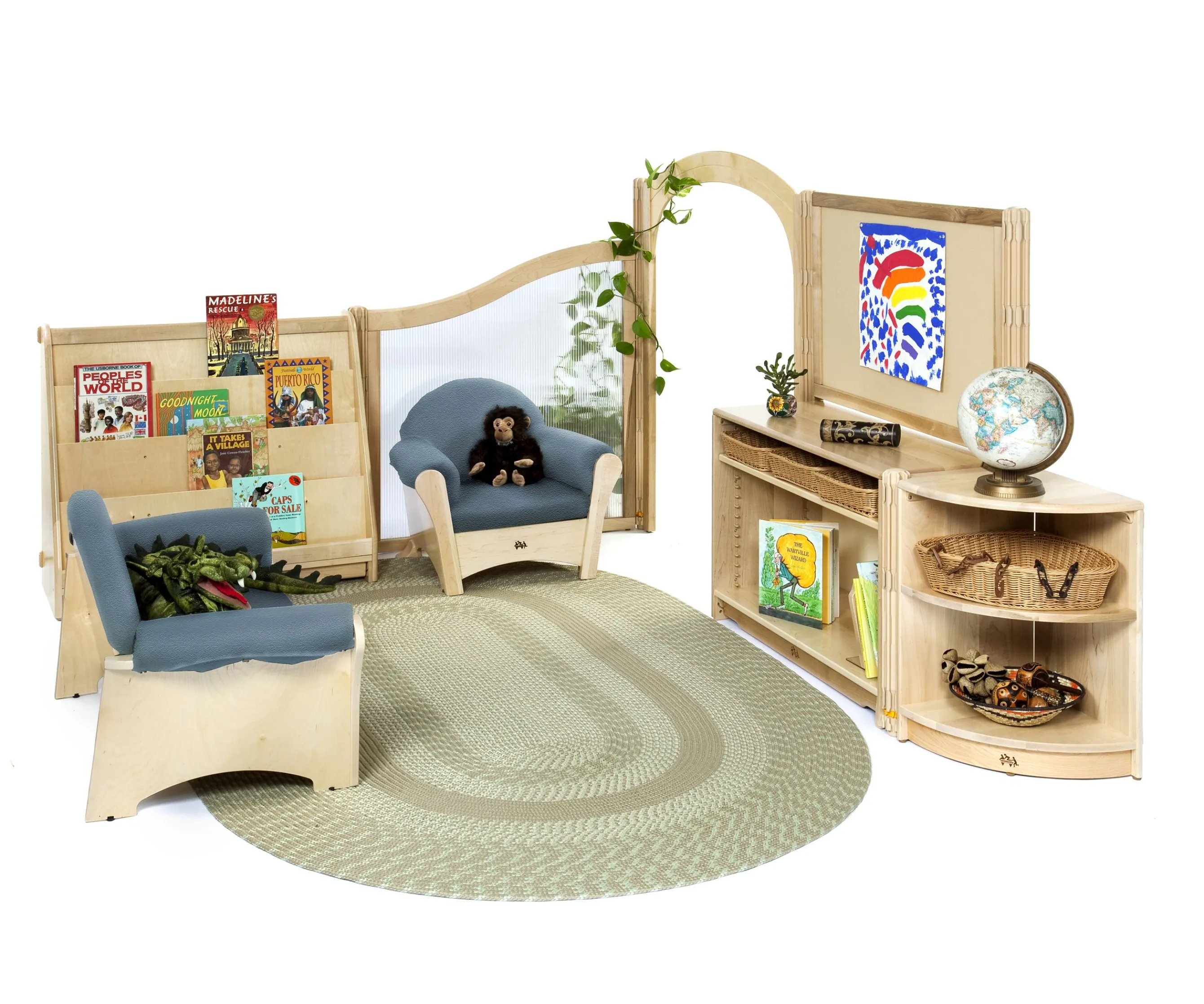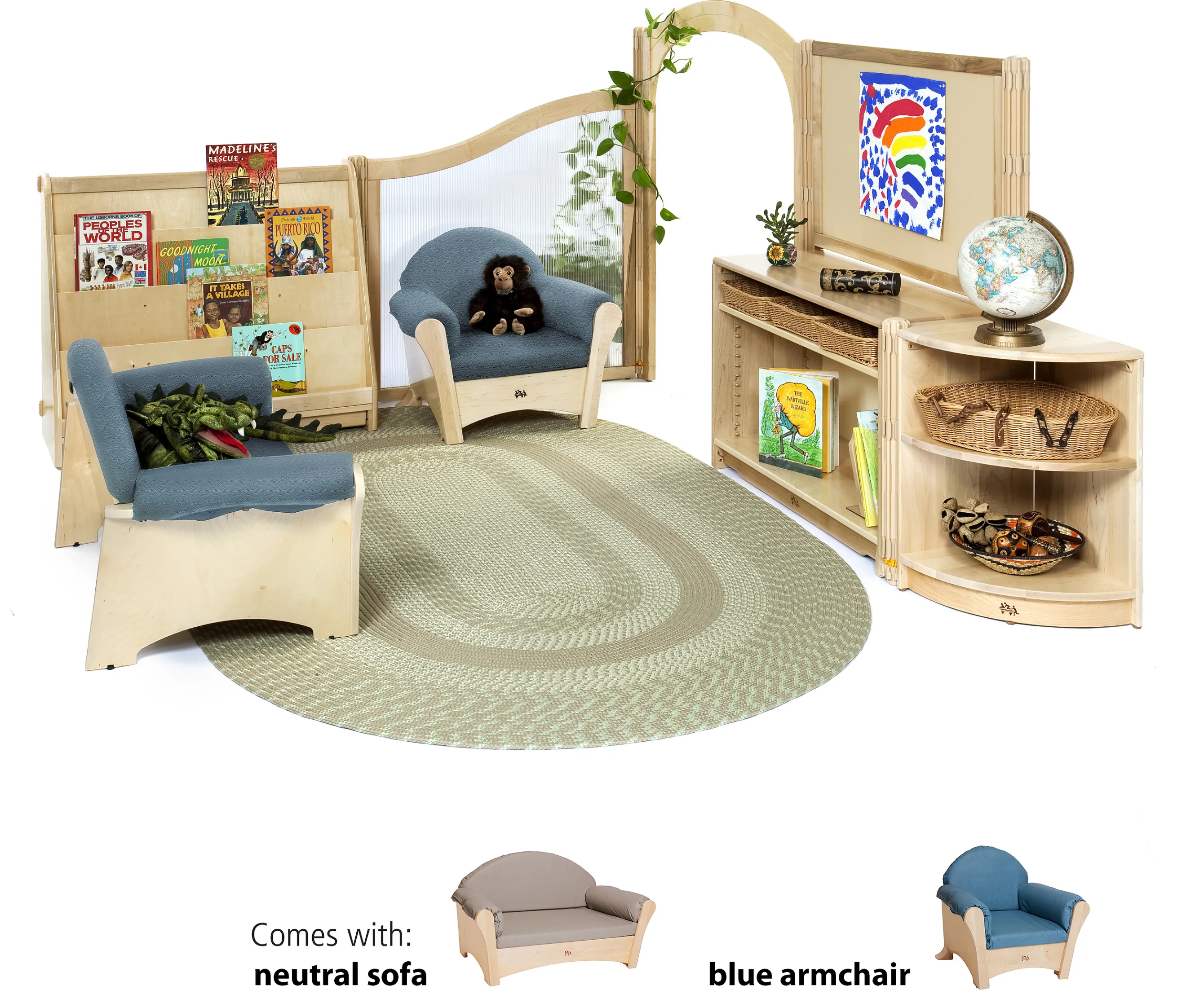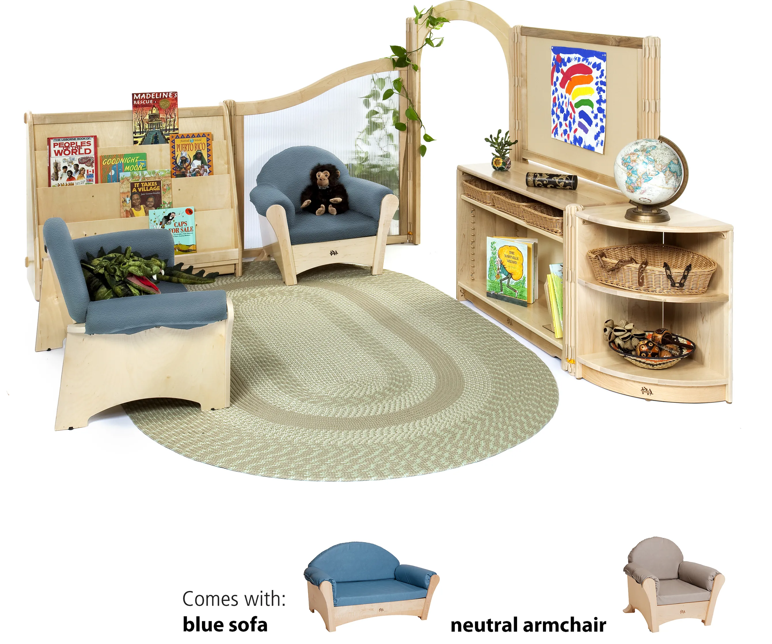 This beautiful, mini library is an open invitation to curl up on the sofa and savor a good book. Set includes everything needed for a quick, tool-free assembly. Sofa and Armchair come in neutral or blue.