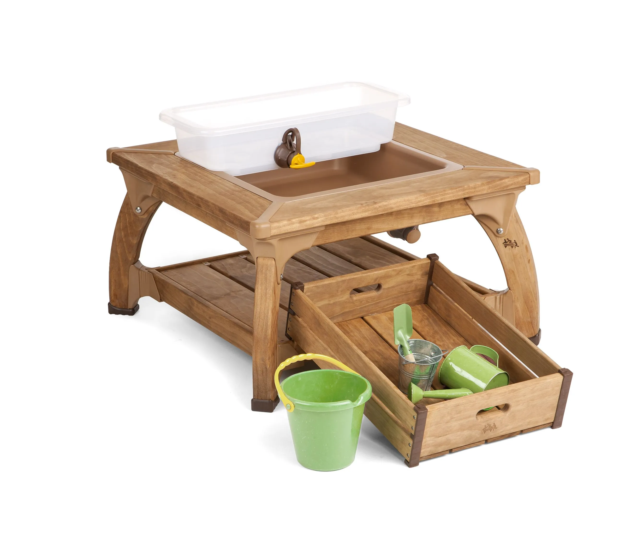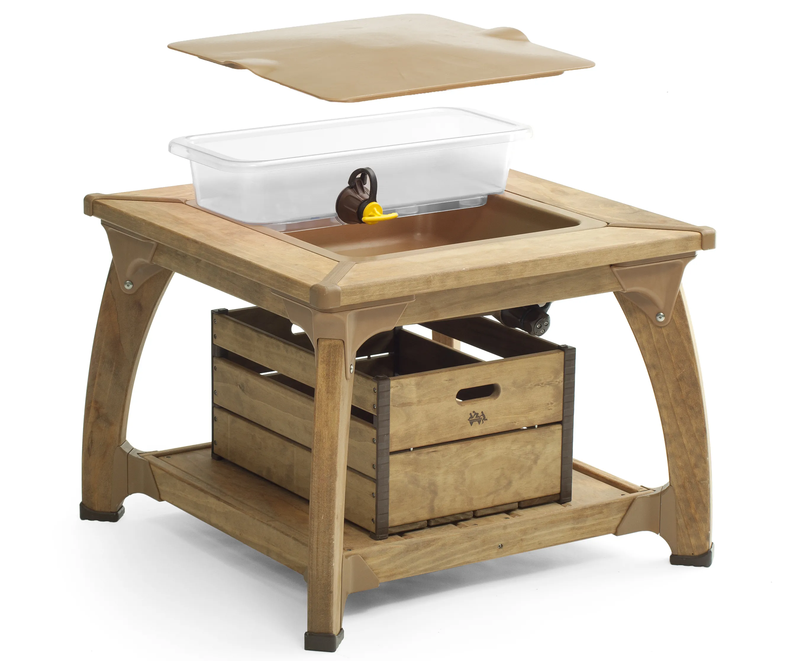 Fully weatherproof construction makes this the perfect outdoor sensory table. The recessed tub has a large drain to make clean up easy. Crate below the table keeps loose parts close at hand. The flow pan adds a second layer for experimentation with water flow. Choose from two age-appropriate heights.