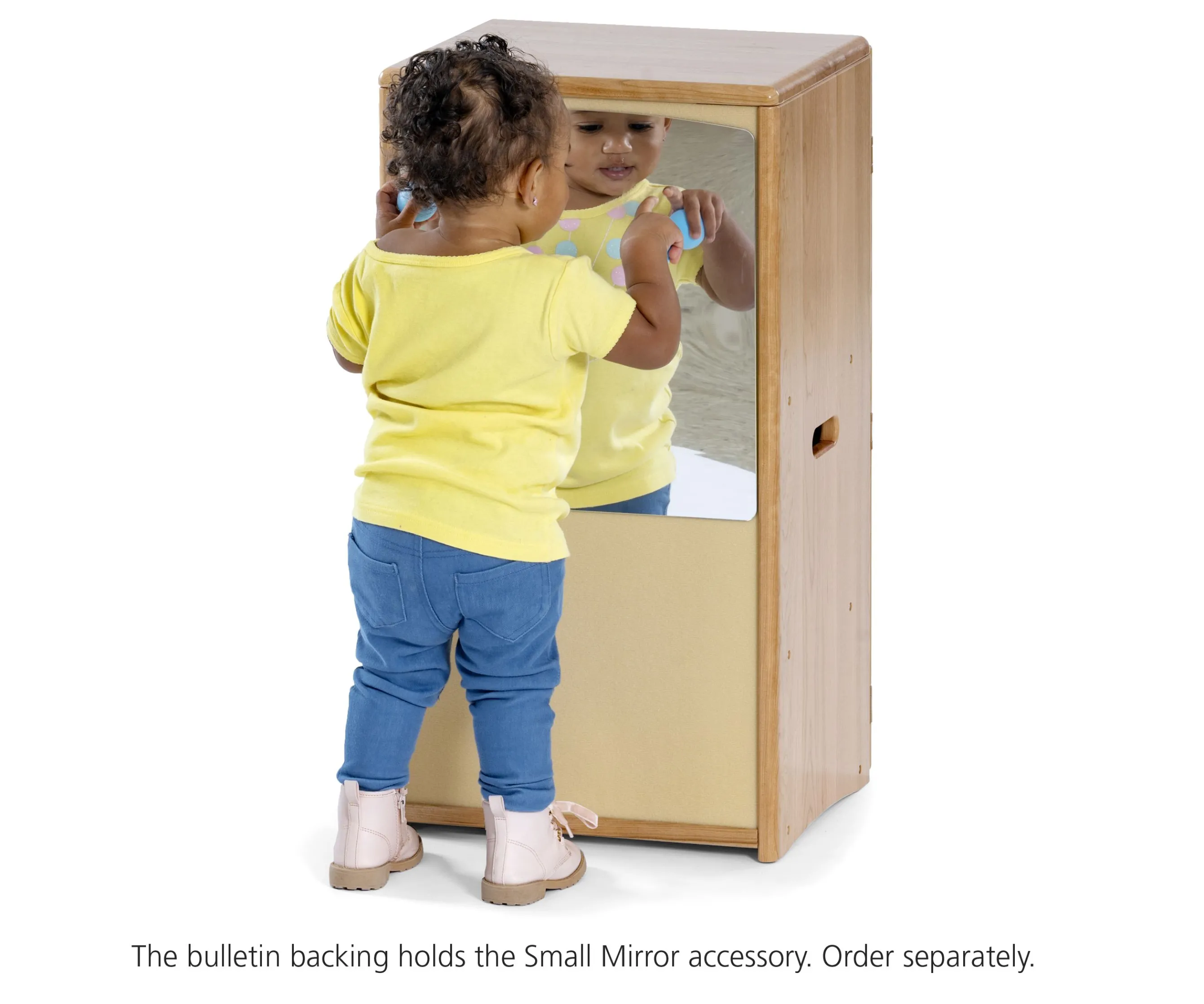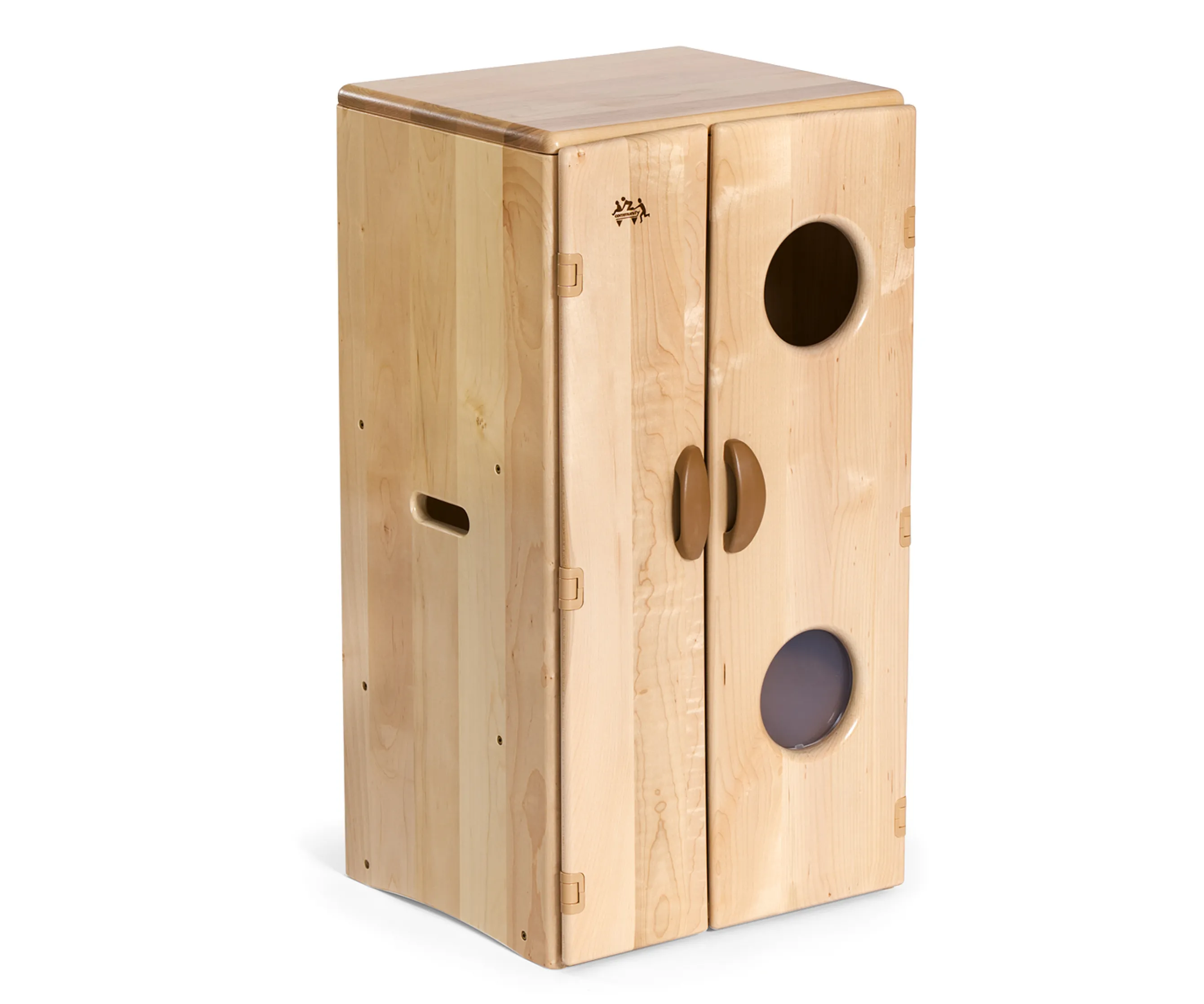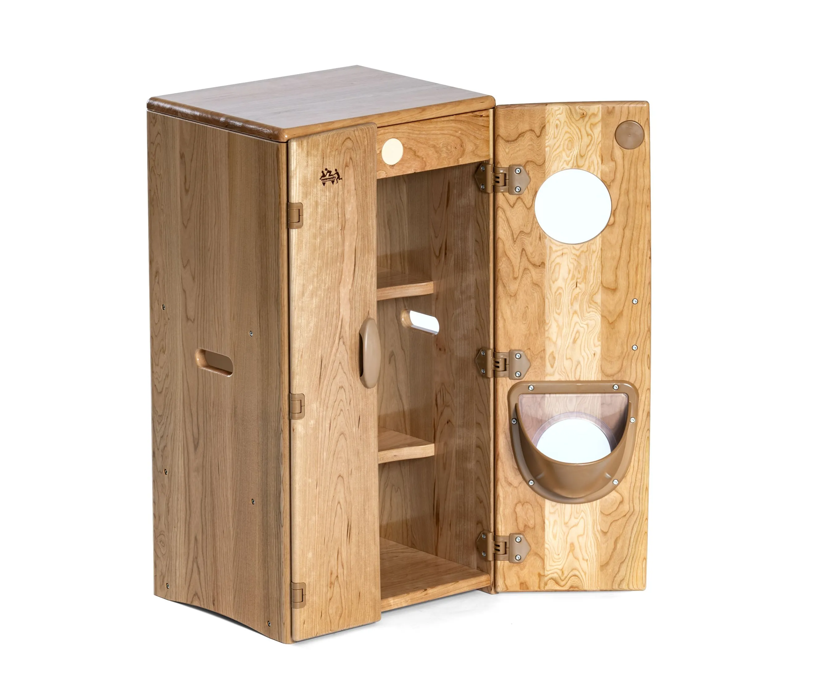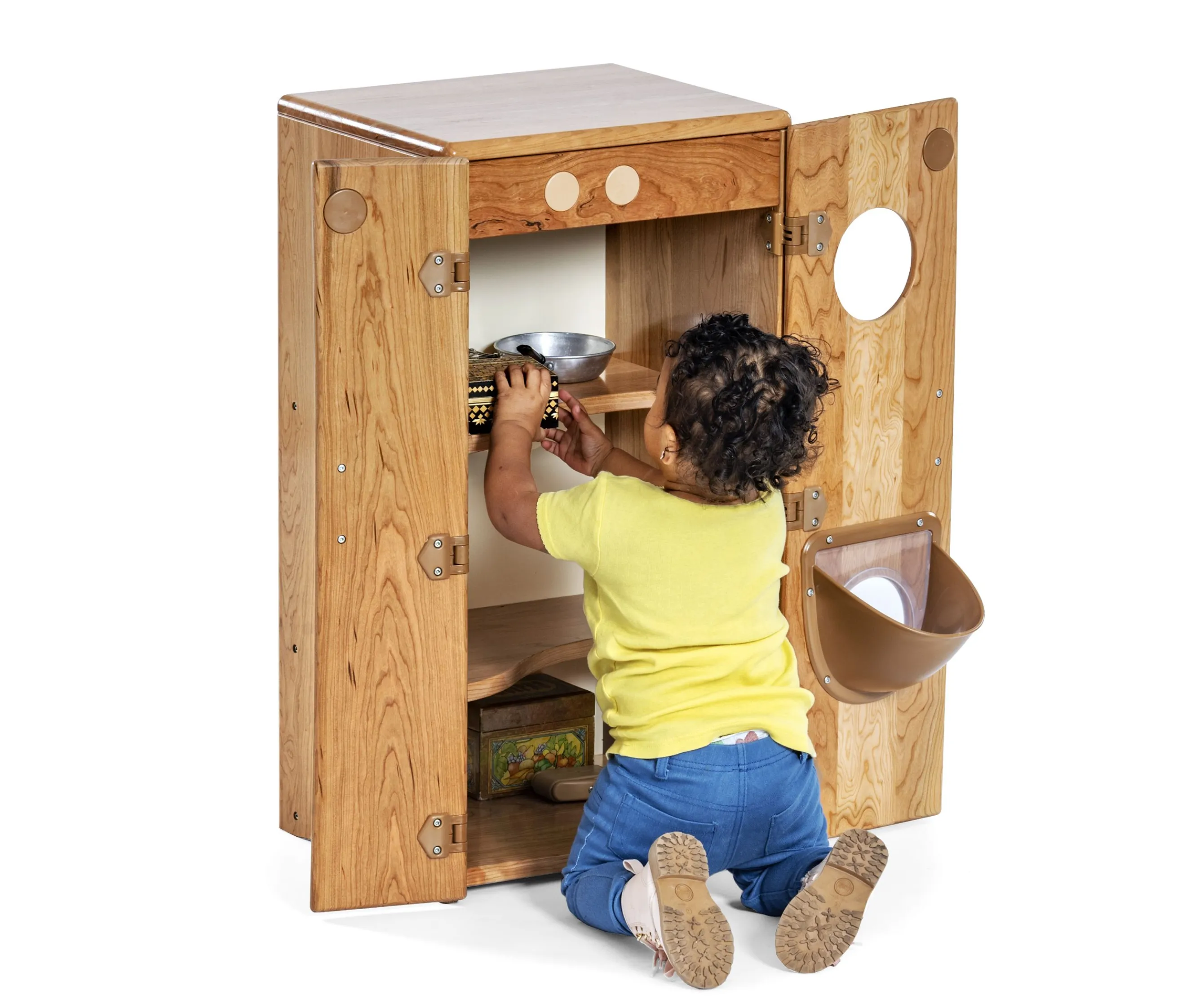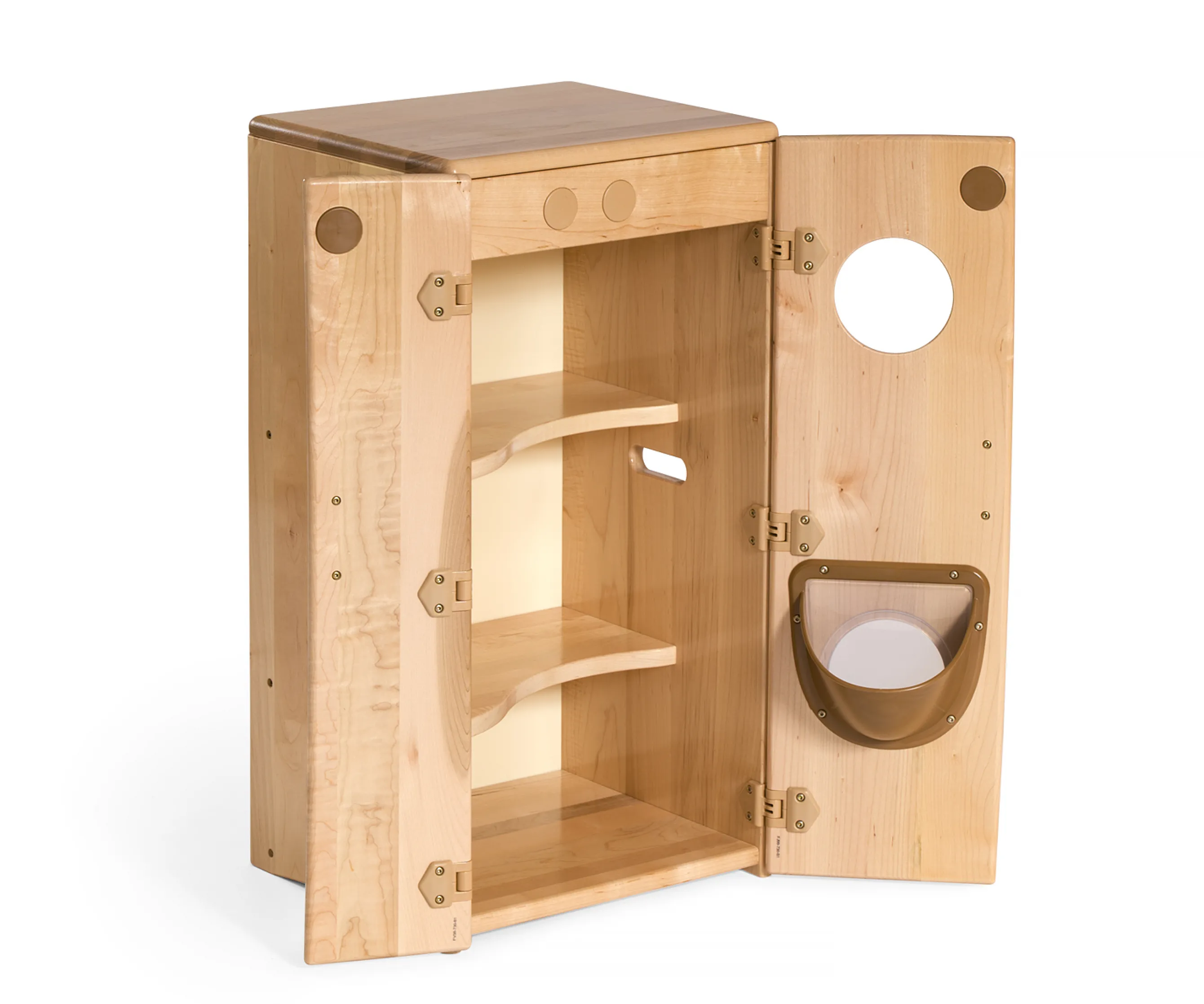 This roomy Fridge adds storage space for kitchen play props. The porthole on door invites exploratory play—objects dropped through the hole appear in the window below.Connects with other Toddler Village units using a childproof/Tool-free connector.Constructed out of solid wood, this unit will give you decades of service. Choose maple or cherry.