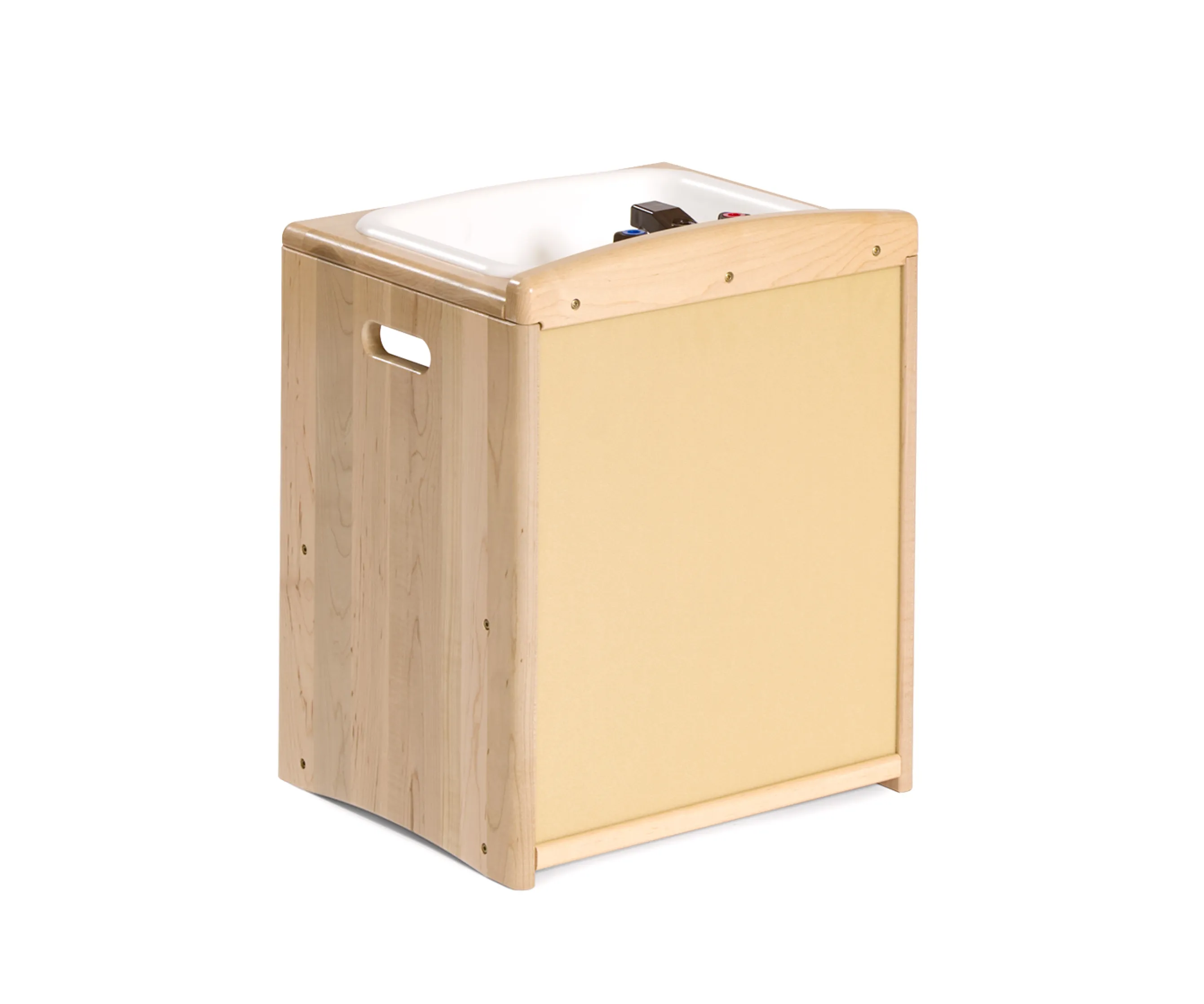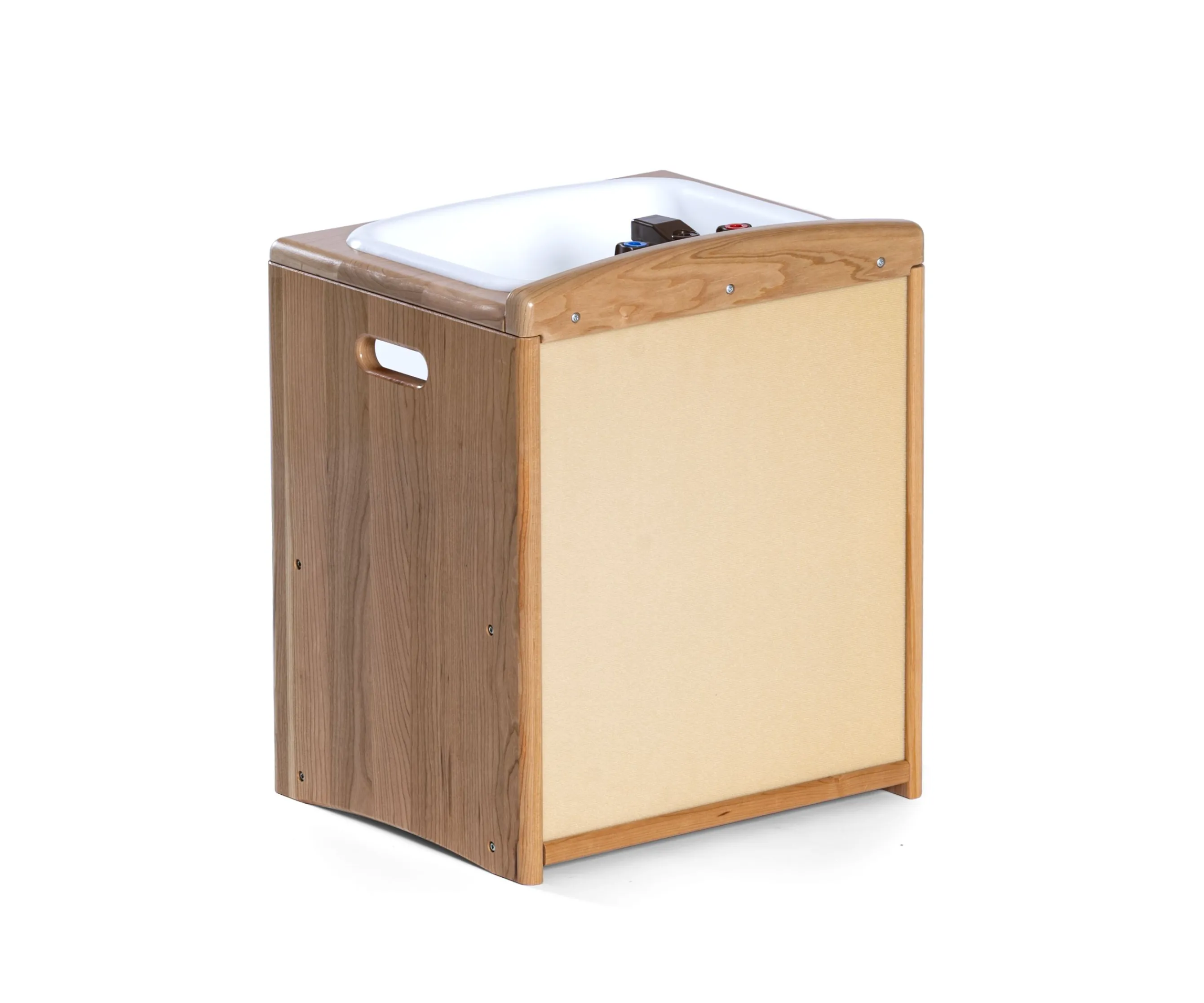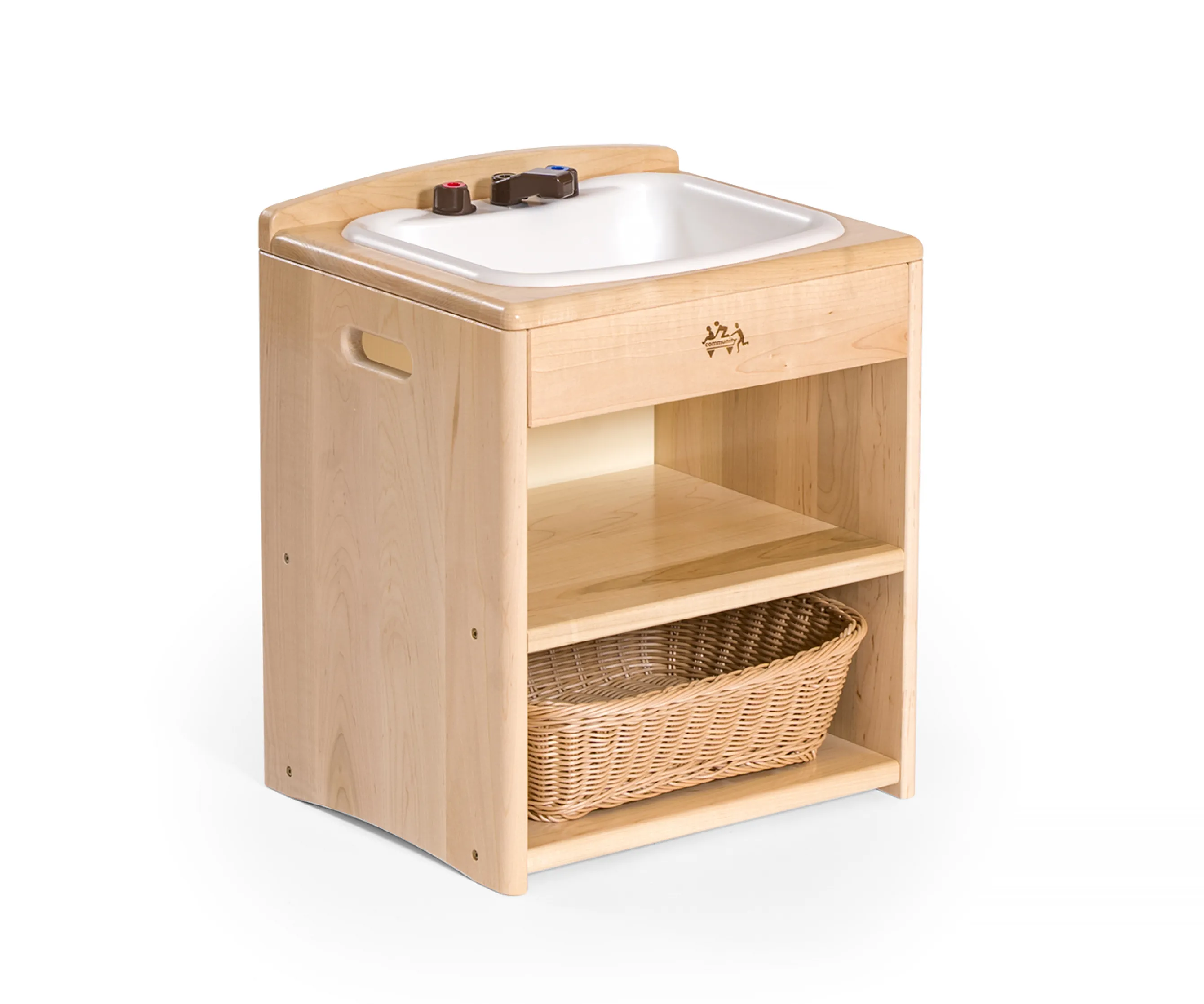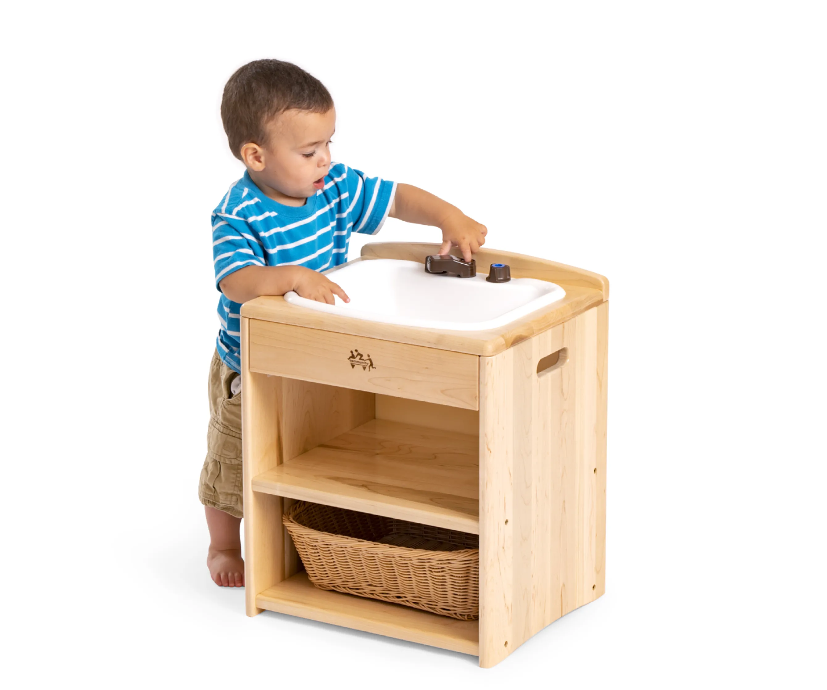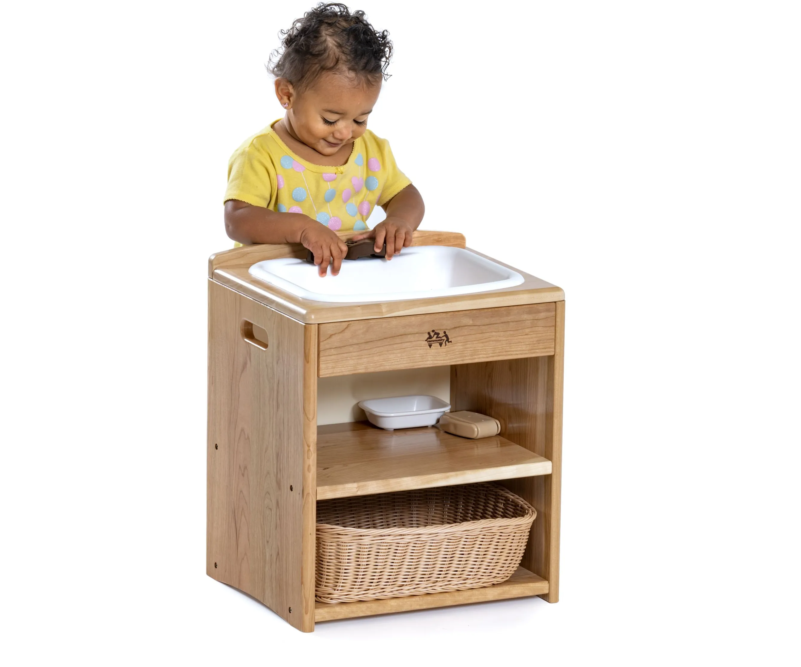 Every kitchen needs a sink! With easy-to-turn knobs, a swiveling faucet, and a fixed dishpan, this toddler-friendly unit is designed for little hands to explore. Crafted from solid hardwood, the Toddler Sink connects securely—without tools—to other Toddler Village improving the stability of your play set!. Choose maple or cherry.