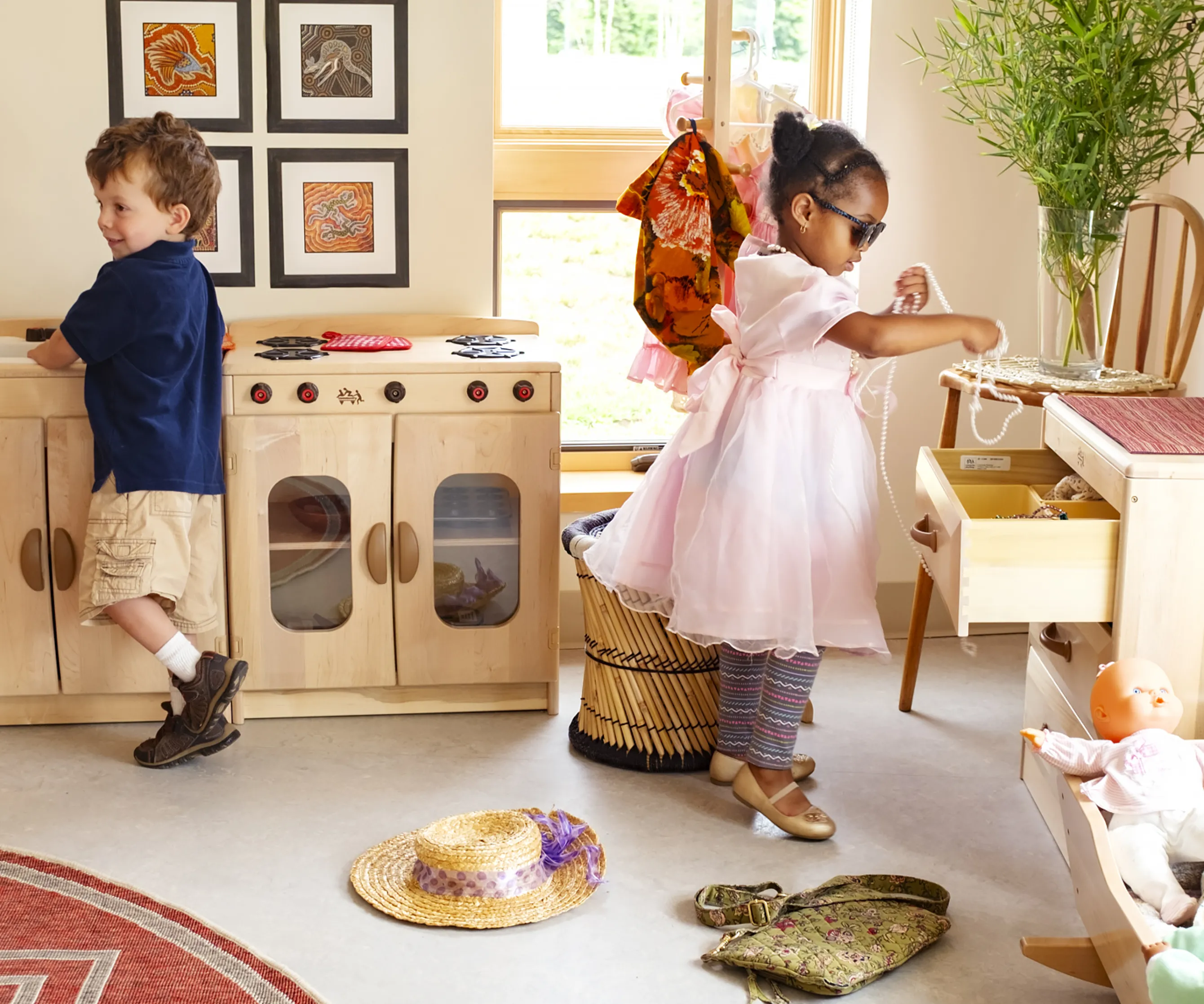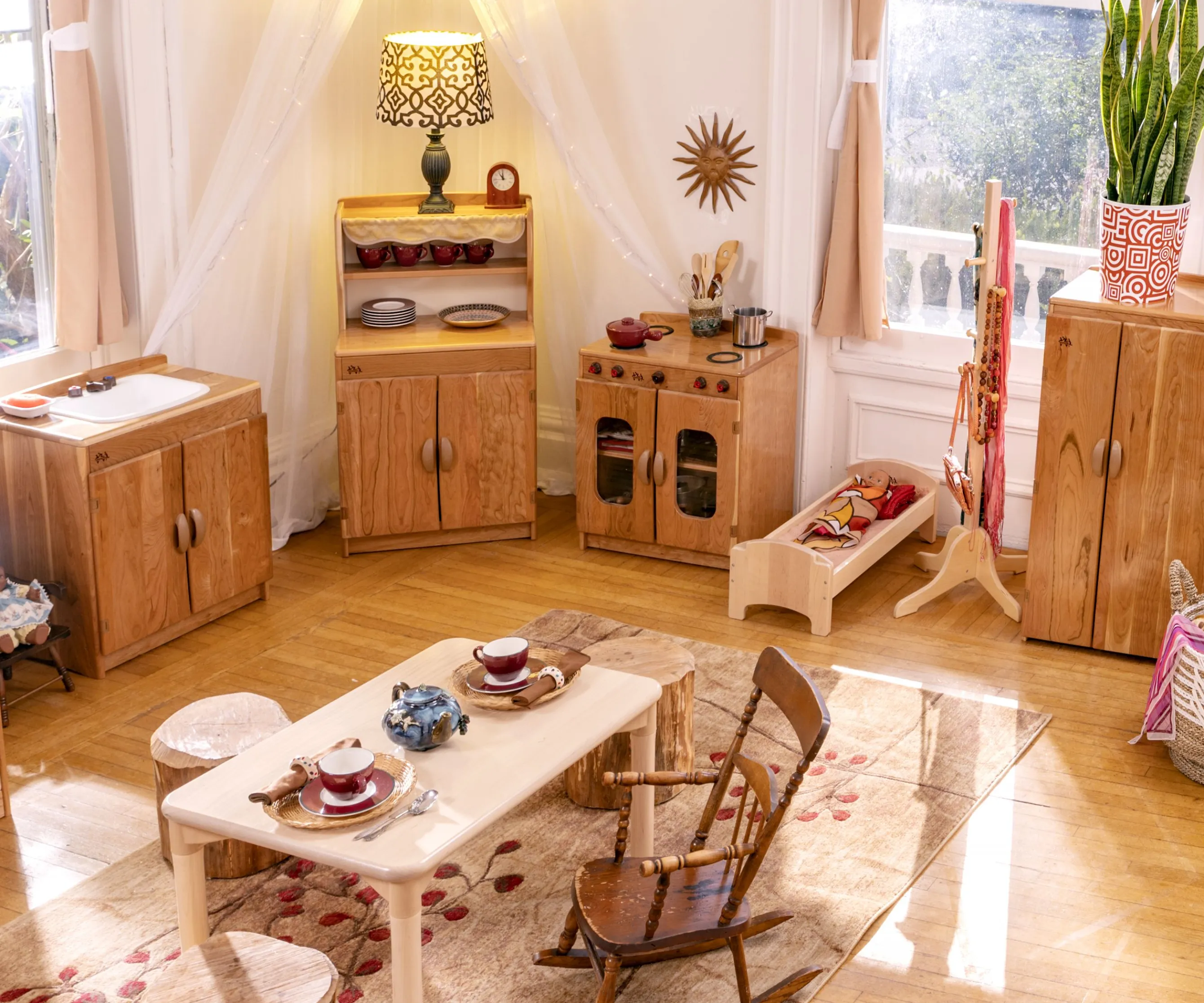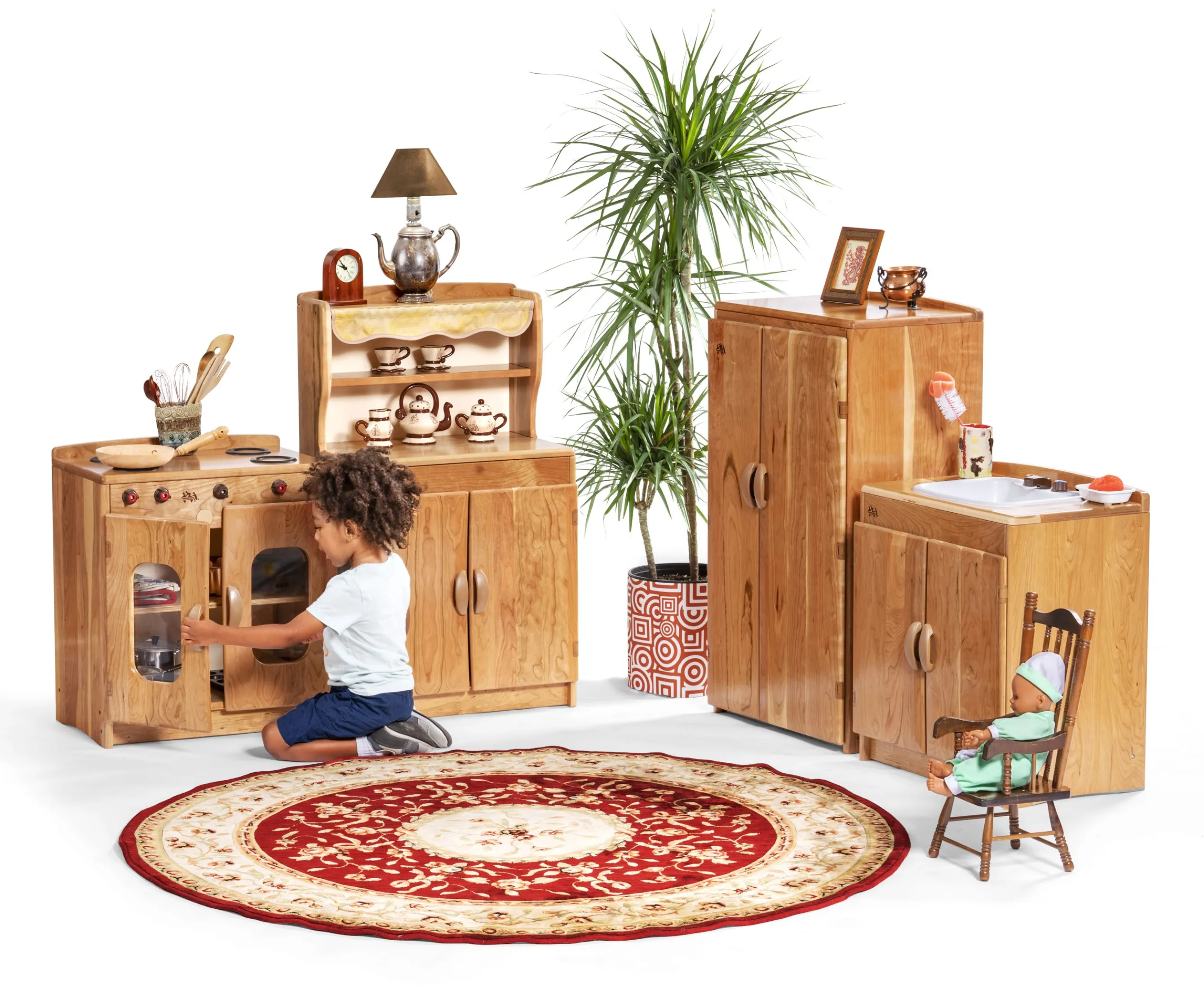 This four-piece kitchen set is just the right height for young cooks. With knobs that turn, doors that open, and raised burners, the Play Kitchen creates a child-size world of work and play. Whether you choose solid maple or the deeper tones of cherry wood, these units will give you decades of service.